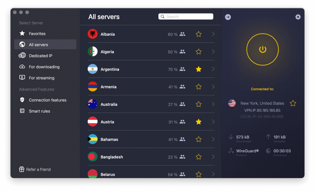 • Over 11,500 servers in 100+ countries ensures you can always find a nearby, fast server.