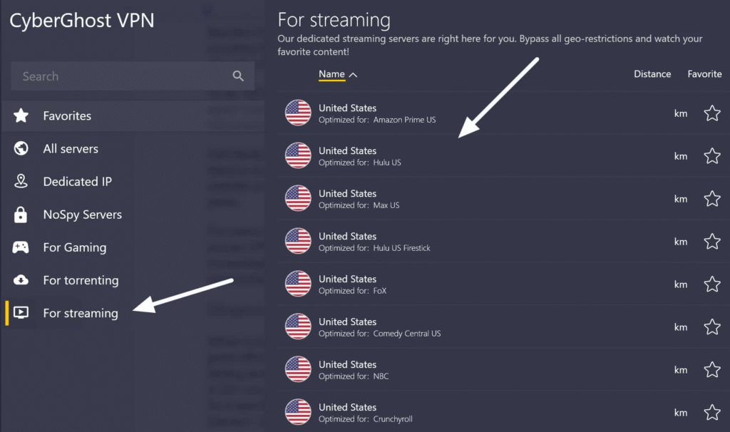 • Specialized servers for streaming, torrenting (P2P), gaming, and NoSpy options owned and operated by CyberGhost for enhanced privacy.